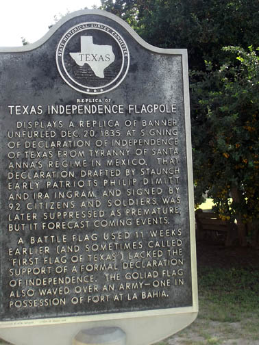 | Carol and the monument at the grave of Texan Army Col. James Fannin and his men, who were captured at Goliad and executed en masse here on Palm Sunday, 27 Mar 1836, one of the bloodiest days of the Texas War for Independence. |